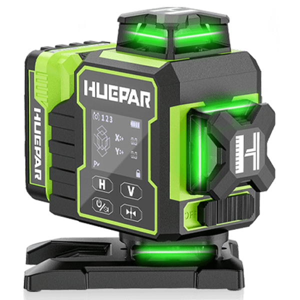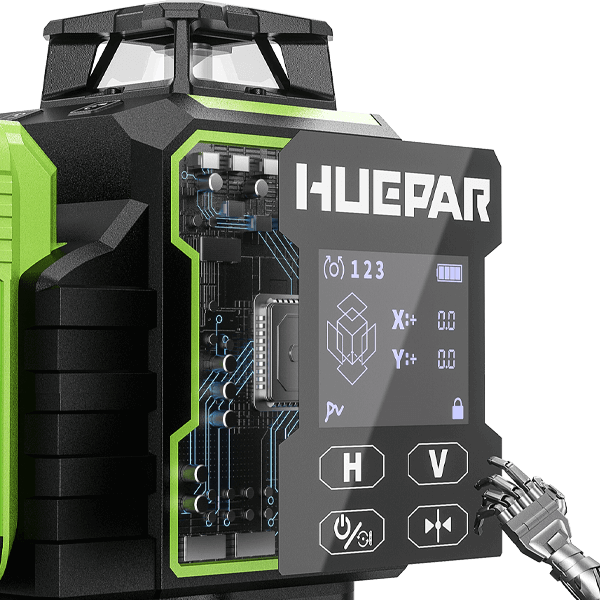 Das Huepar W04CG Laserlevel verfügt über einen hochauflösenden LCD-Bildschirm, der klare Sichtbarkeit der wesentlichen Parameter auch bei schwachen Lichtverhältnissen gewährleistet. Der Bildschirm bietet Echtzeitinformationen wie Batteriestatus, Neigungswinkel der X/Y-Achse, Drehgeschwindigkeit und -richtung, Laserlinienzusammensetzung, Pulsmodus-Status und Pendelschlossstatus.
